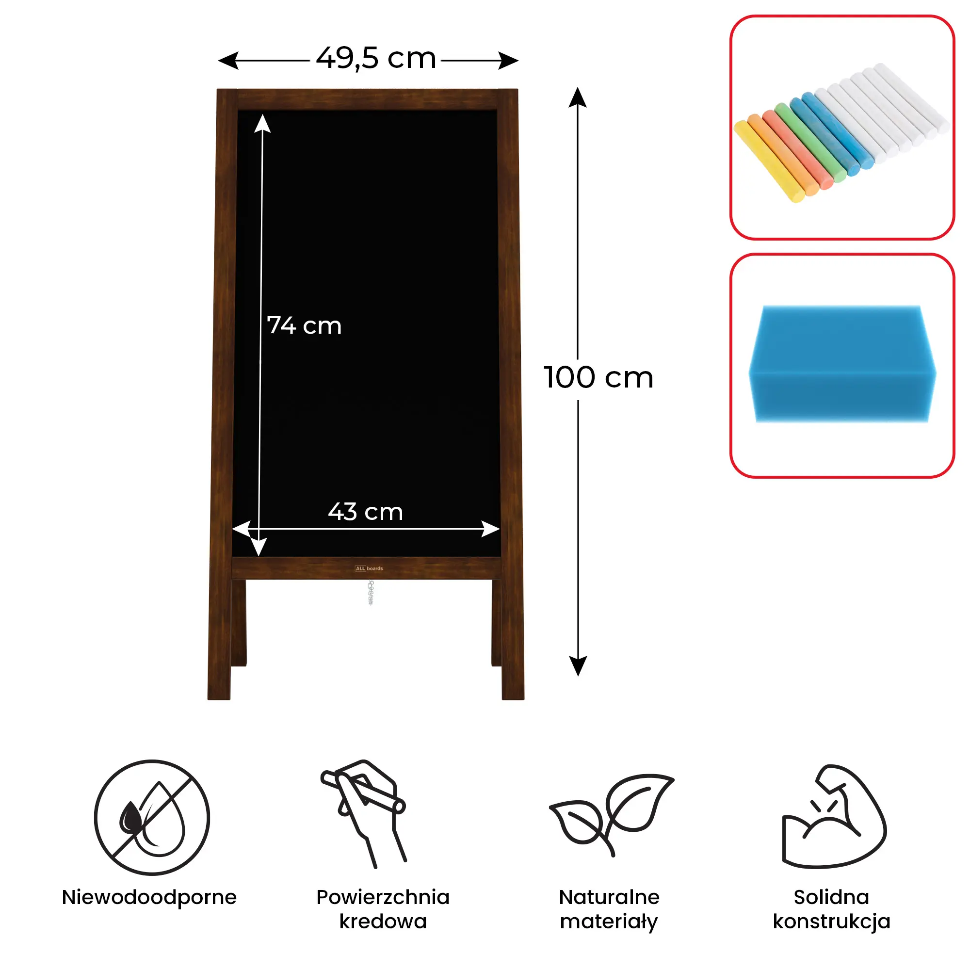 - POWIERZCHNIA - potykacz wyposażony jest w czarną, kredową tablicę do pisania, wykonaną z płyty HDF o wysokiej gęstości. Jest bardzo trwała, można po niej pisać kredą oraz markerami kredowymi. Płyta znajduje się z obu stron produktu, co czyni go dwustronnym!