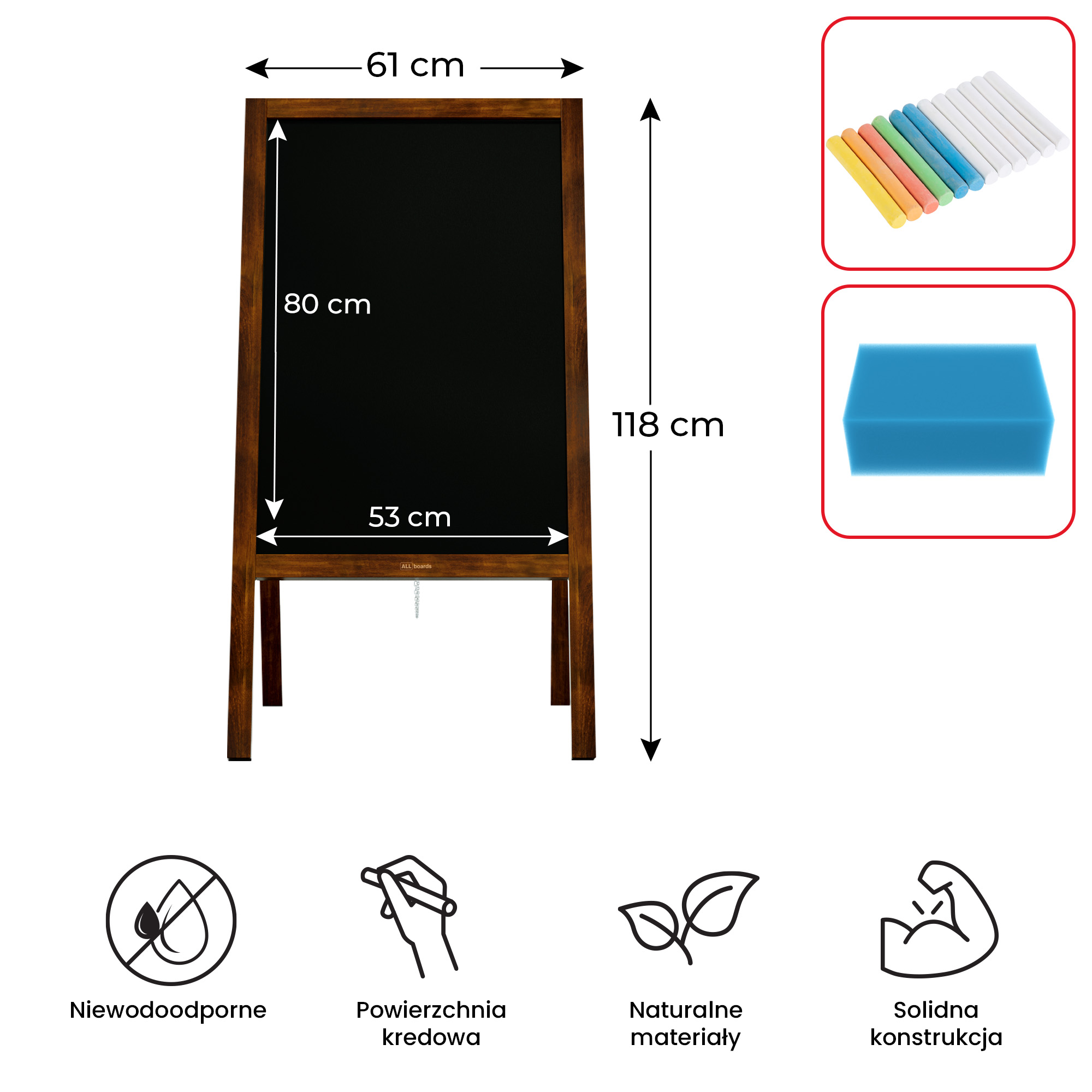 - POWIERZCHNIA - potykacz wyposażony jest w czarną, kredową tablicę do pisania, wykonaną z płyty HDF o wysokiej gęstości. Jest bardzo trwała, można po niej pisać kredą oraz markerami kredowymi. Płyta znajduje się z obu stron produktu, co czyni go dwustronnym!