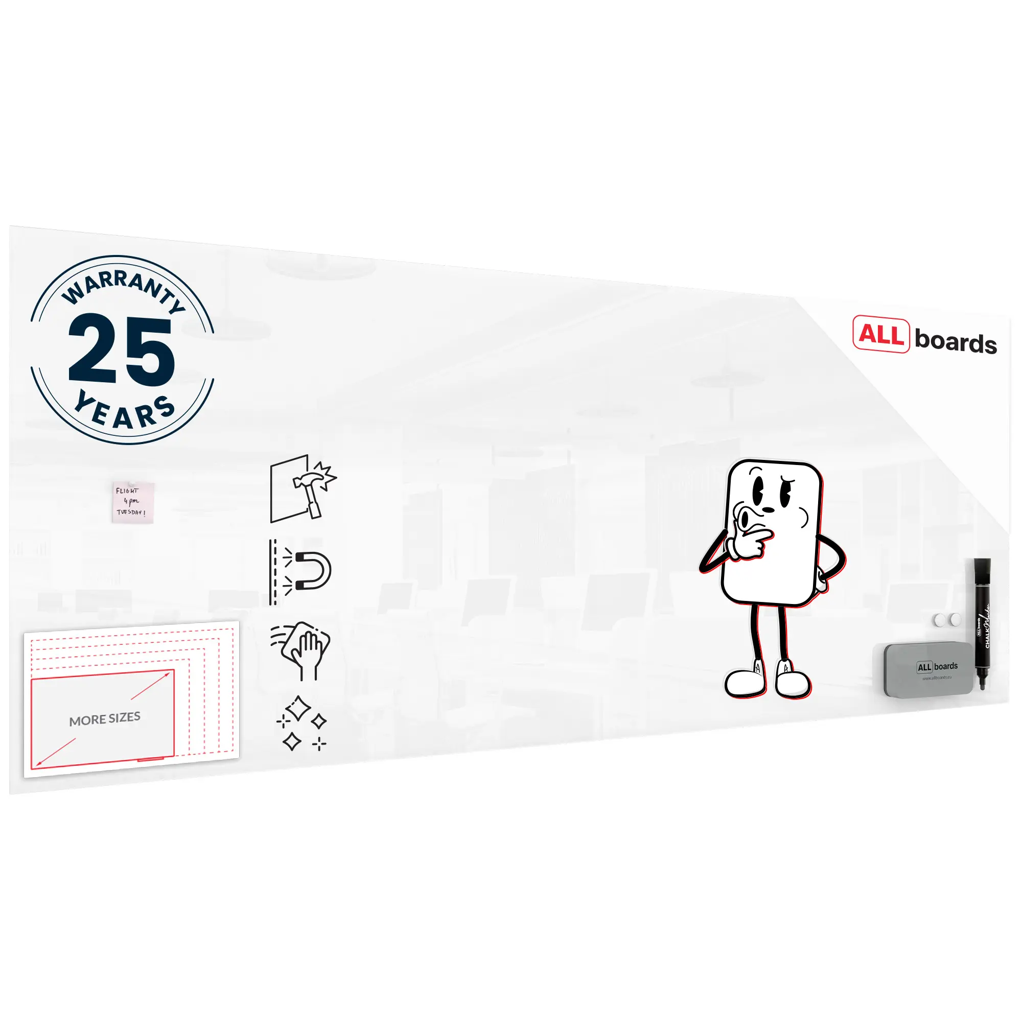 Do wykonania tablicy zostało wykorzystane szkło hartowane o grubości 4 mm.  Krawędzie szkła są szlifowane, a narożniki ścięte do kąta prostego.  Zapewnia to bezpieczeństwo w codziennym użytkowaniu. Dzięki szklanej powierzchni tablica jest bardzo łatwa w codziennej pielęgnacji.