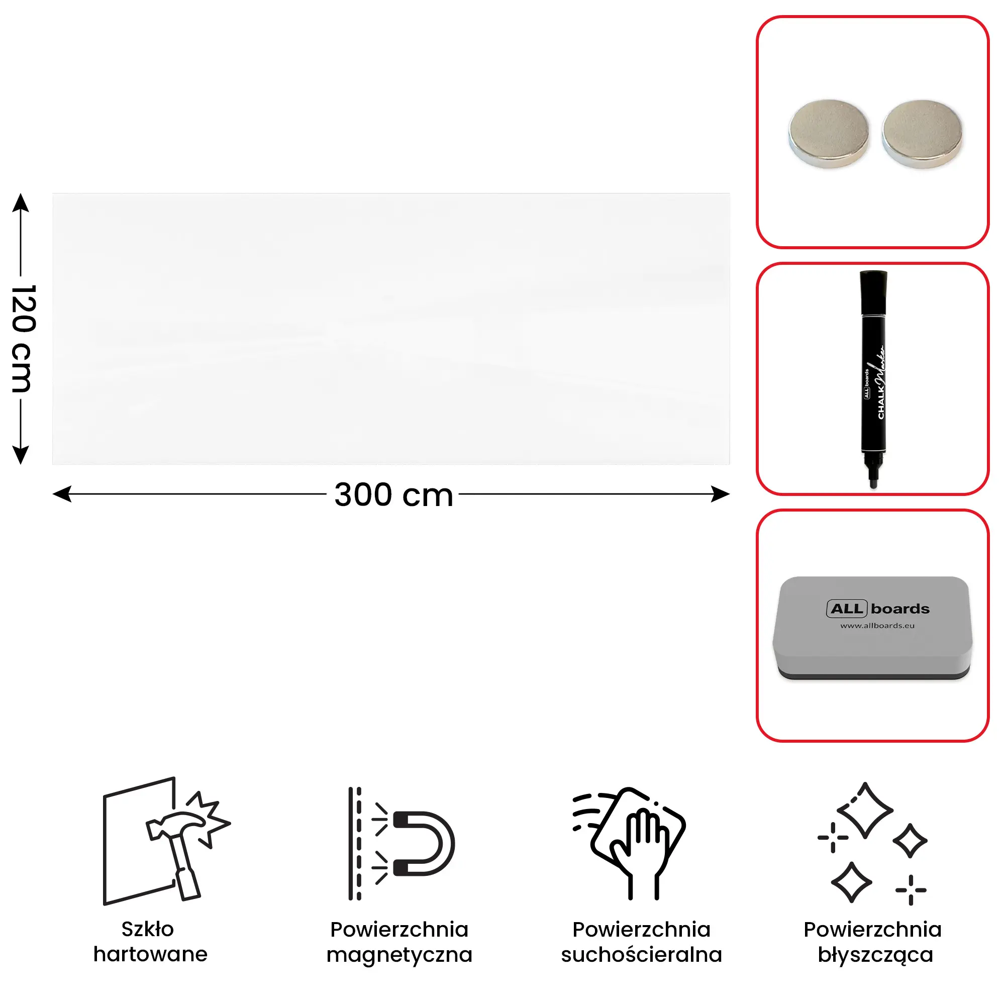 Szklana tablica magnetyczna 300x120 cm PREMIUM SUPERWHITE (super biała) + GRATIS