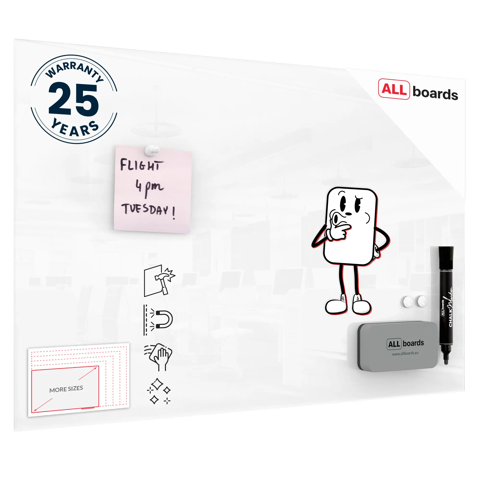 Do wykonania tablicy zostało wykorzystane szkło hartowane o grubości 4 mm.  Krawędzie szkła są szlifowane, a narożniki ścięte do kąta prostego.  Zapewnia to bezpieczeństwo w codziennym użytkowaniu. Dzięki szklanej powierzchni tablica jest bardzo łatwa w codziennej pielęgnacji.