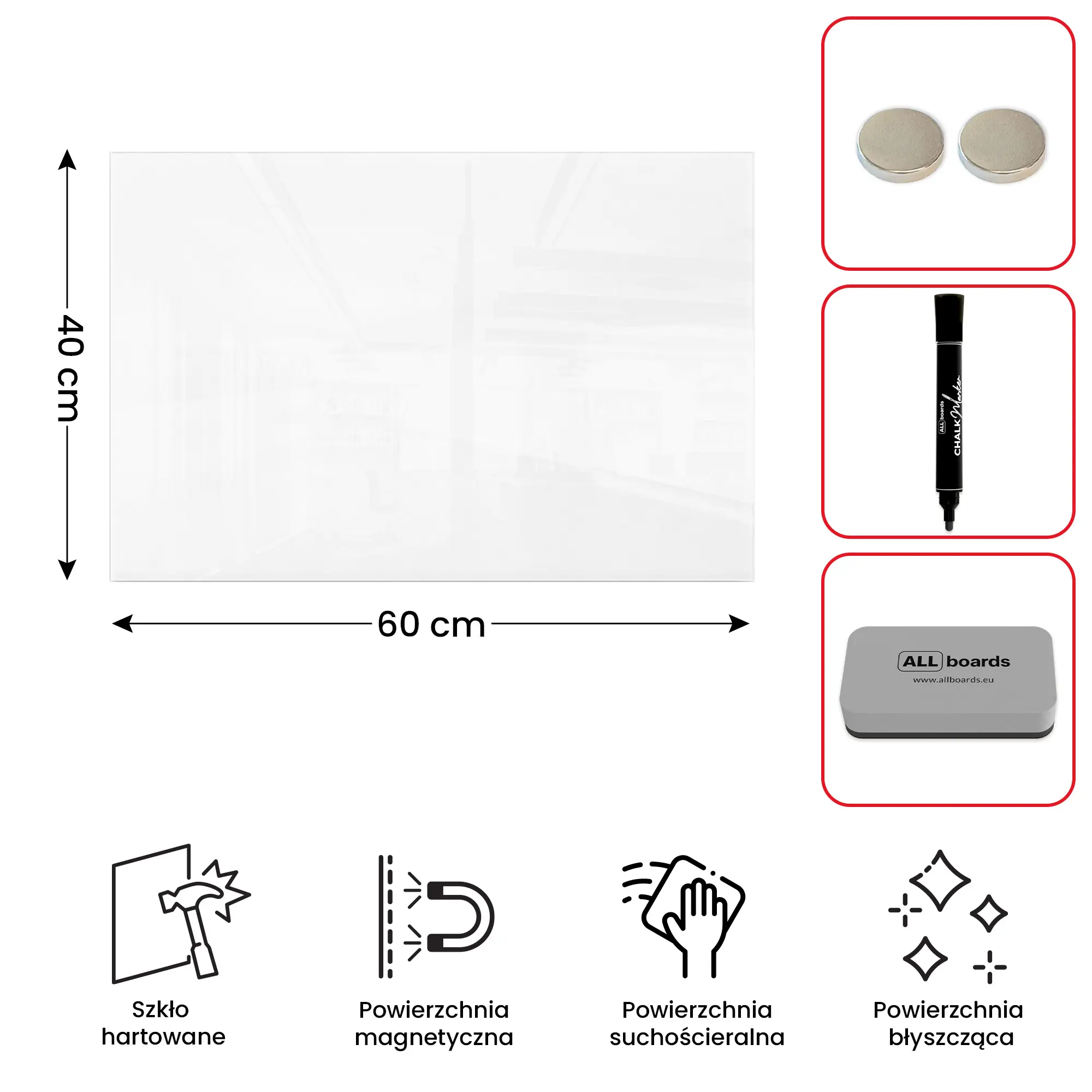 Szklana tablica magnetyczna 60x40 Premium SUPERWHITE + GRATIS