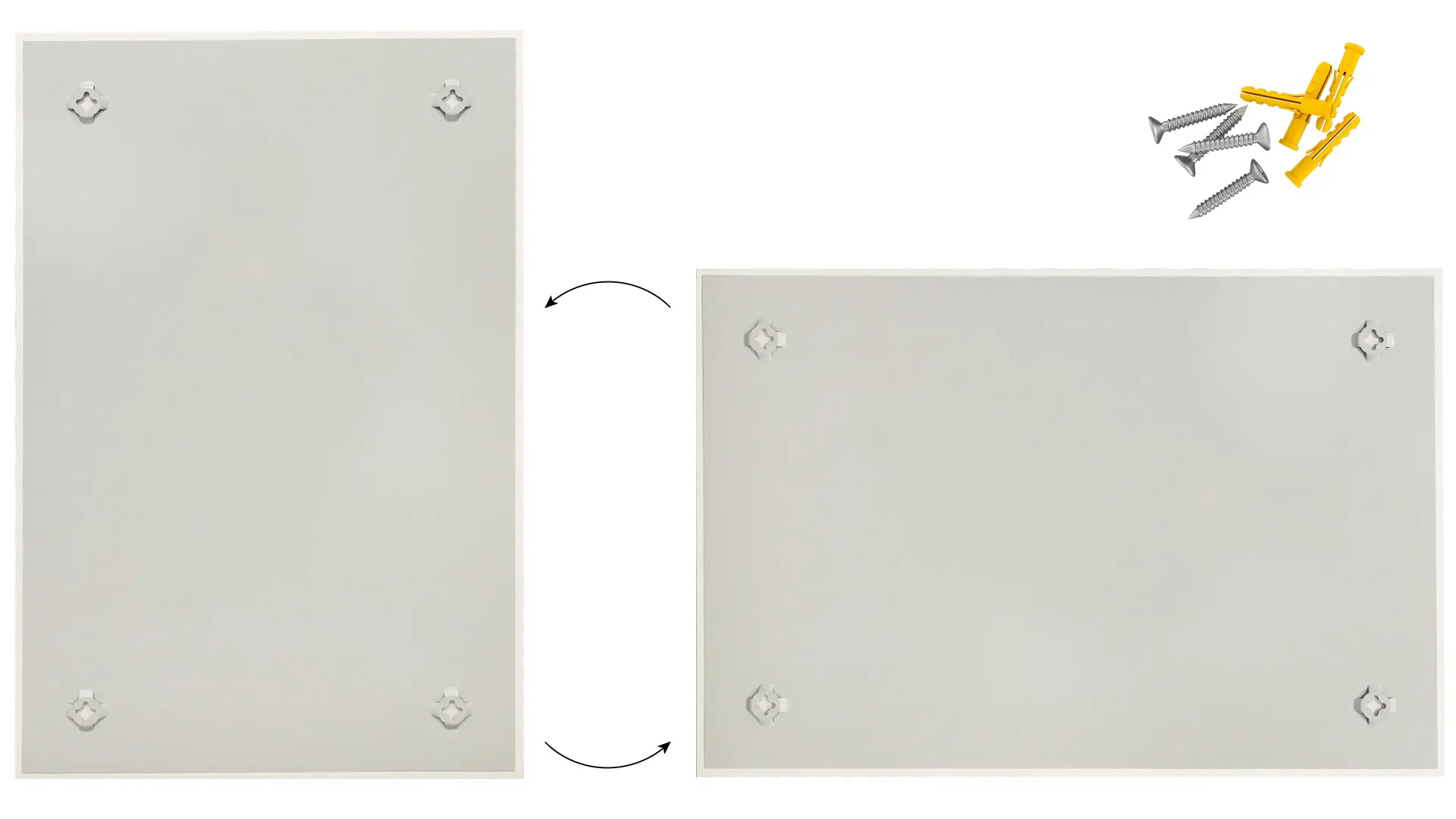 Tablica jest wyposażona w mocowania, które umożliwiają łatwe zawieszenie w pionie lub poziomie (zależnie od preferencji). Do montażu zalecamy użycie kołków rozporowych z główką o średnicy 7-8 mm. Mniejszy rozmiar główki wkręta spowoduje, że tablica spadnie, natomiast większy rozmiar główki nie zmieści się w otworze wytłoczonej zawieszki. Pamiętaj, że zamontowana tablica powinna odstawać od ściany na ok. 5 mm.