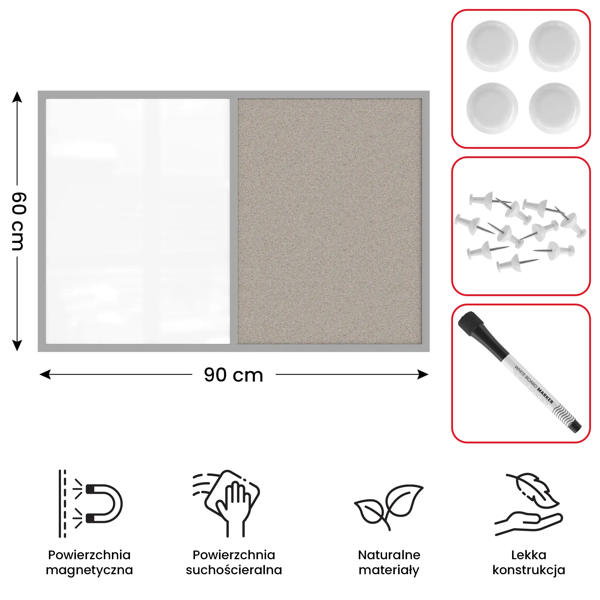 Tablica COMBI korkowa szary korek / biała magnetyczna 90x60 rama drewniana lakierowana szara + GRATIS