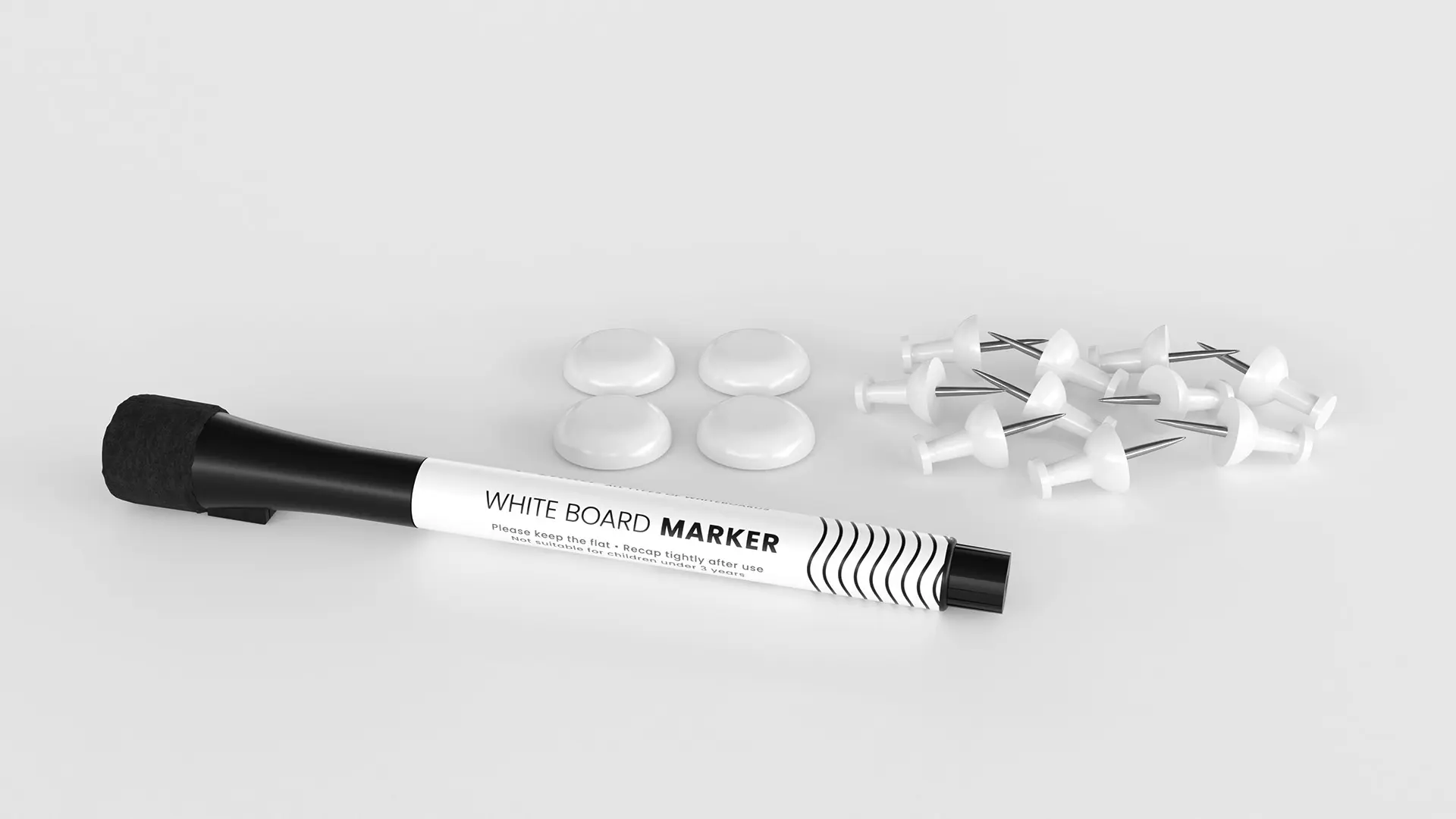 Do tablicy dołączamy 4 szt. białych magnesów, czarny marker, 10 szt. białych pinezek.