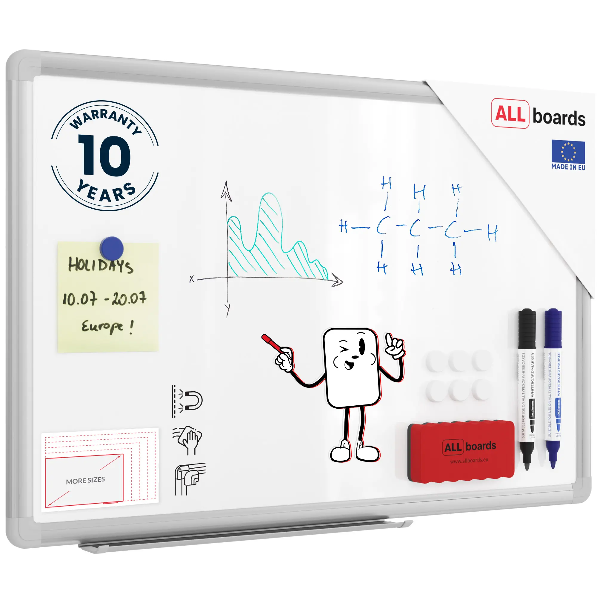 Powierzchnia tablicy wykonana jest z wysokiej jakości stali i została polakierowana na biało. Tusz z markerów suchościeralnych jest łatwo usuwalny za pomocą gąbki do tablic. Tablica magnetyczna nadaje się zatem do wykonywania notatek, a przy pomocy magnesów można przypiąć do niej pilne dokumenty. W zestawie znajdują się elementy do montażu oraz półka na akcesoria.