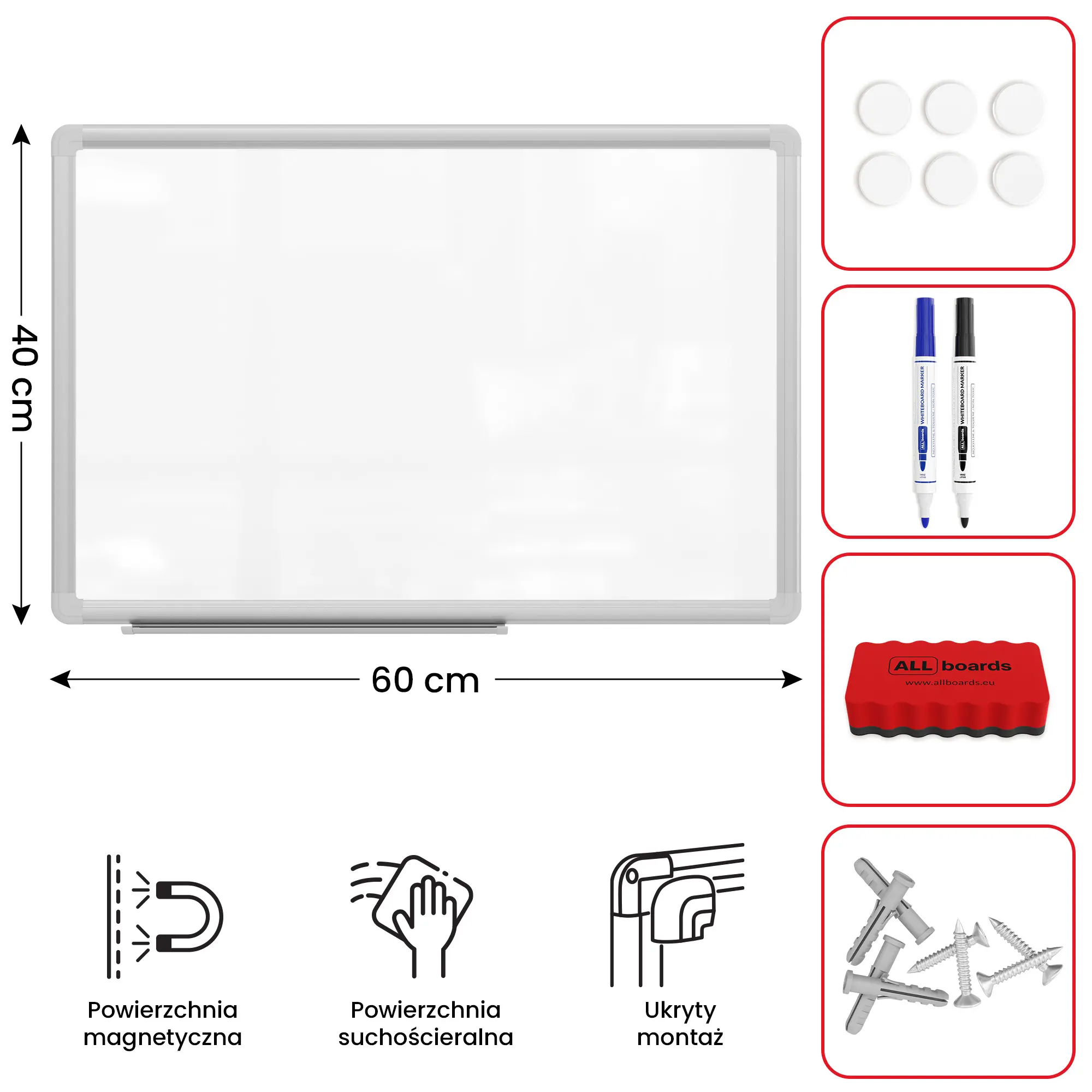 Tablice magnetyczne suchościeralne naścienne — Przydatne w firmie, w szkole, w przedszkolu i w domu, wszędzie tam, gdzie istnieje potrzeba dynamicznego nanoszenia notatek. Tablicę można powiesić na ścianie w orientacji poziomej lub pionowej, tablica doskonale nadaje się do prezentacji treści.