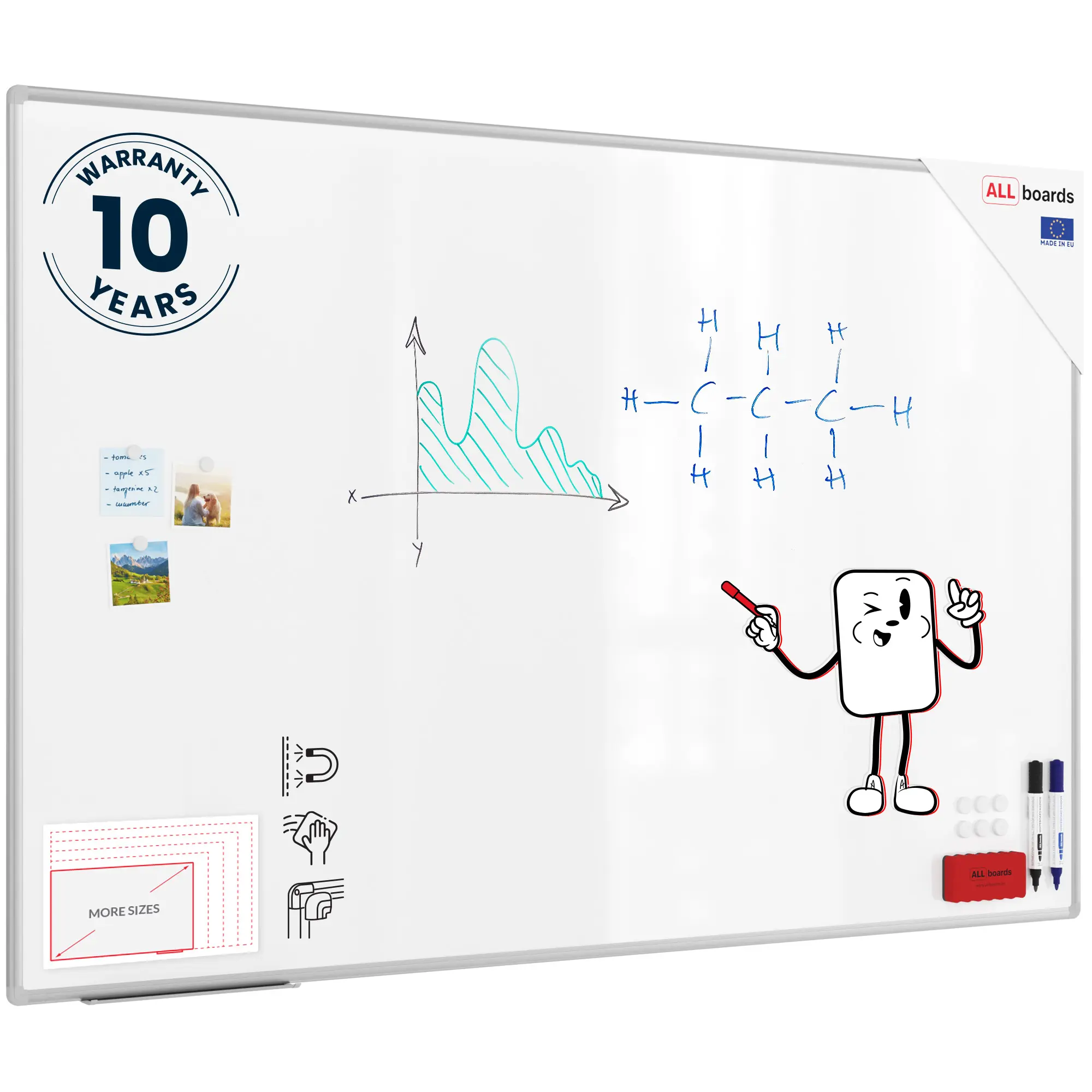 Powierzchnia tablicy wykonana jest z wysokiej jakości stali i została polakierowana na biało. Tusz z markerów suchościeralnych jest łatwo usuwalny za pomocą gąbki do tablic. Tablica magnetyczna nadaje się zatem do wykonywania notatek, a przy pomocy magnesów można przypiąć do niej pilne dokumenty. W zestawie znajdują się elementy do montażu oraz półka na akcesoria.